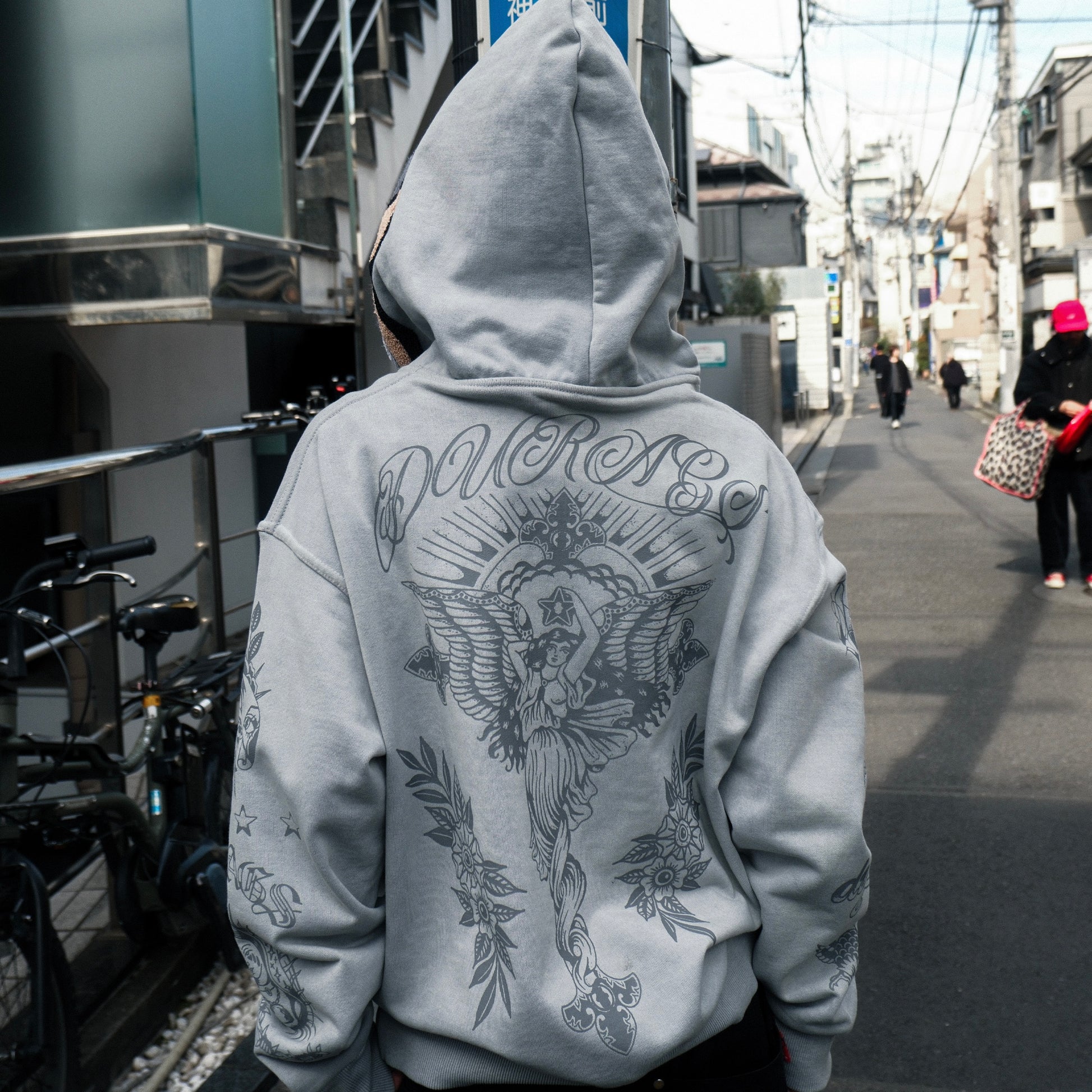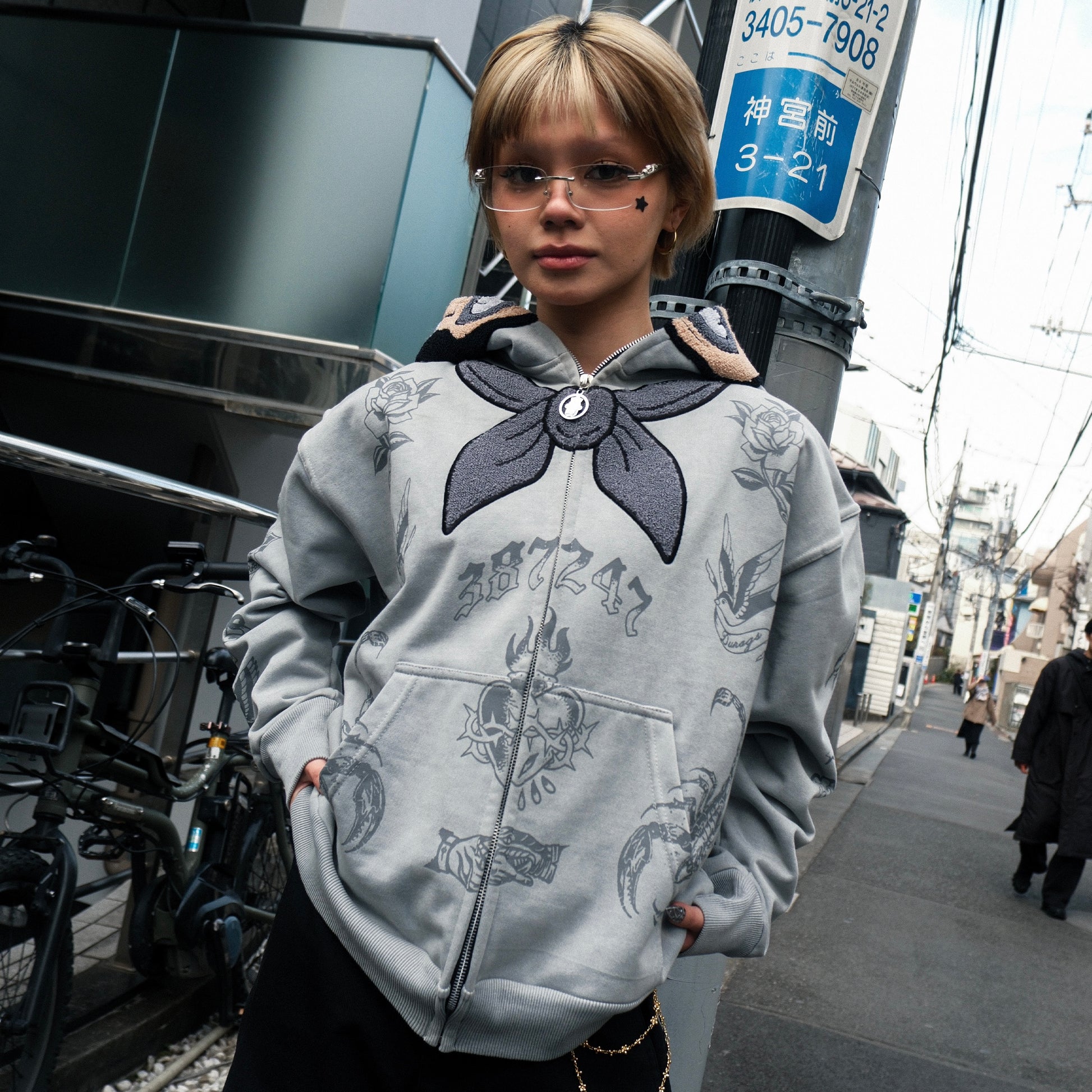 Large graphics on front, back and sleeves. Chenille Embroidery.